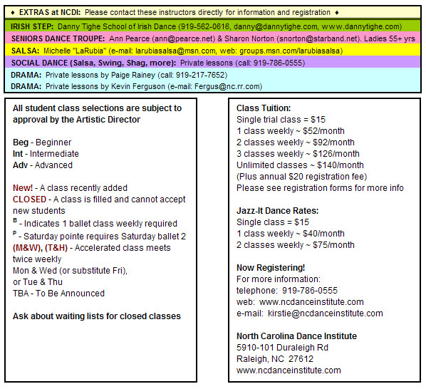North Carolina Dance Institute Fall 2004 / Spring 2005 Schedule August 2, 2004 through May 28, 2005 (40 weeks) Closed: Holiday/Semester Break Dec 20 - Jan 2 & Spring Break Mar 21 - 27
