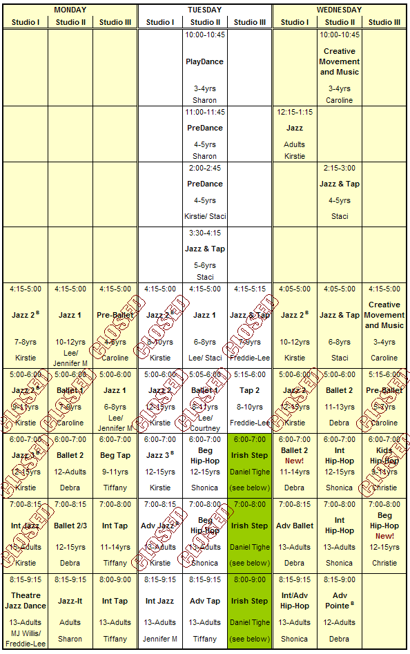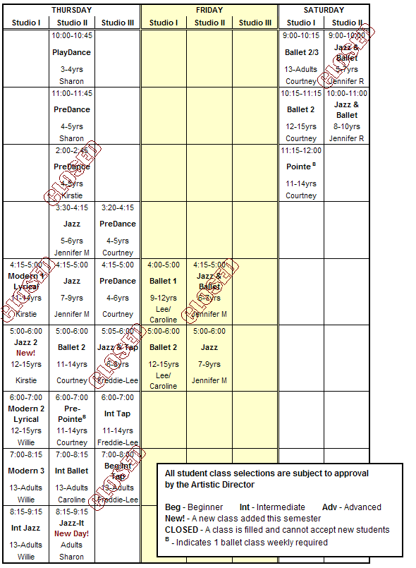 Classes - Spring Schedule - Summer Dance Camps - Summer Dance Explosion - Summer Class Schedule - Fall 2004 / Spring 2005 Class Schedule - Registration
