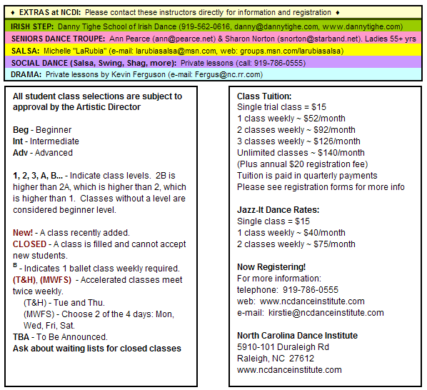 North Carolina Dance Institute 2005-2006 Class Schedule August 1, 2005 - May 28, 2006 (40 weeks) Closed: Holiday/Semester Break Dec 19 - Jan 1 & Spring Break Mar 27 - April 2
