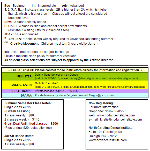 North Carolina Dance Institute Summer 2006 Class Schedule June 12 - July 29 (6-week session) Studio Closed July 3 - 8 • Flexible makeup class policy for summer vacations Also see the 2006 Summer Dance Camps
