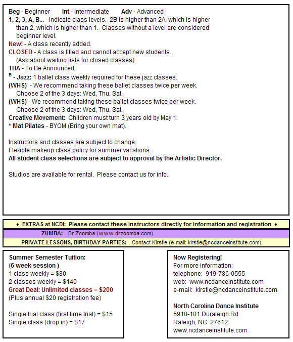 North Carolina Dance Institute Summer 2009 Class Schedule June 15 - July 25 (6-week session) Studio open July 4 • Flexible makeup class policy for summer vacations Also see the 2009 Summer Dance Camps