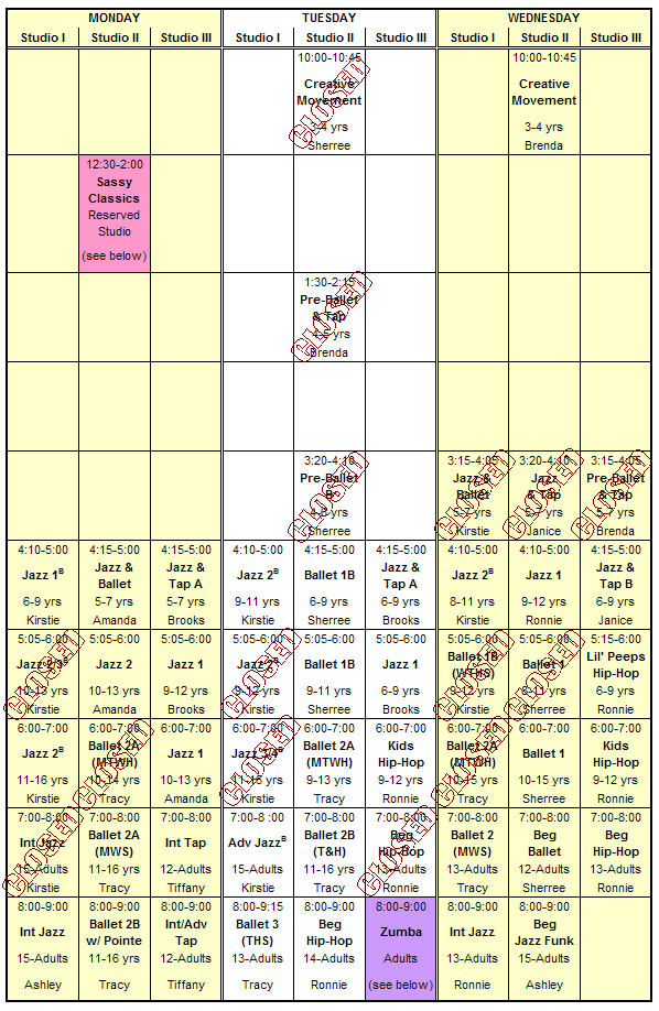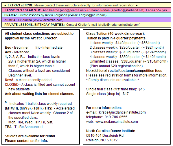 North Carolina Dance Institute 2009-2010 Class Schedule August 3, 2009 - May 29, 2010 (40 weeks) Closed for Winter Break December 21 - January 3 / Spring Break March 29 - April 3