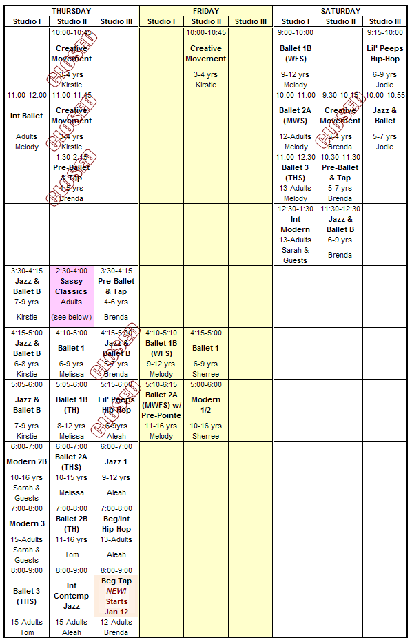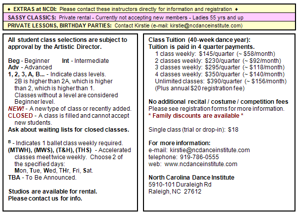 North Carolina Dance Institute 2011-2012 Class Schedule August 1, 2011 - May 26, 2012 (40 weeks) Closed for Winter Break December 19 - January 1 / Spring Break April 2-7