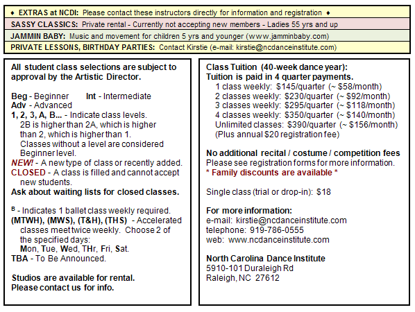 North Carolina Dance Institute 2012-2013 Class Schedule August 6, 2012 - June 1, 2013 (40 weeks) Closed for Winter Break December 20 - January 2 / Spring Break April 1-6