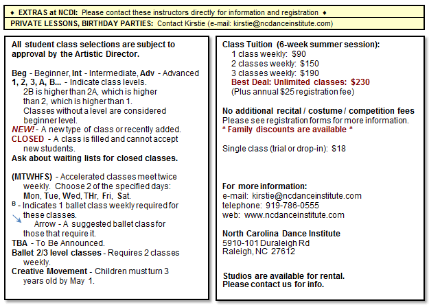 North Carolina Dance Institute Summer 2016 Class Schedule June 13 - July 23 (6-week session) Flexible makeup class policy for summer vacations • Classes will be held the week of July 4 (including Monday July 4) Also see the Summer 2016 Dance Camps
