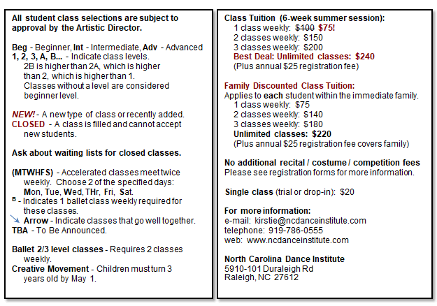 This is our 20th summer session since NCDI began holding classes in June 2001. In celebration of this and as a special thank you for continuing to dance with us during this time, we're reducing the class rate for 1 class weekly to what it was in 2001: $75 (down from $100) for the 6-week session.